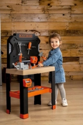 Atelier realist pentru copii Smoby Black+Decker Bricolo Center oferă o masă de lucru mare și robustă cu 78 de piese de accesorii și 7 unelte. O suprafață de lucru largă cu design de lemn, menghină, riglă glisantă și multe compartimente de depozitare asigură ore întregi de creativitate și joacă. Nu lipsește funcția distractivă de bătut cuie și accentul pe sustenabilitate – produsul conține cel puțin 75% material reciclat.
