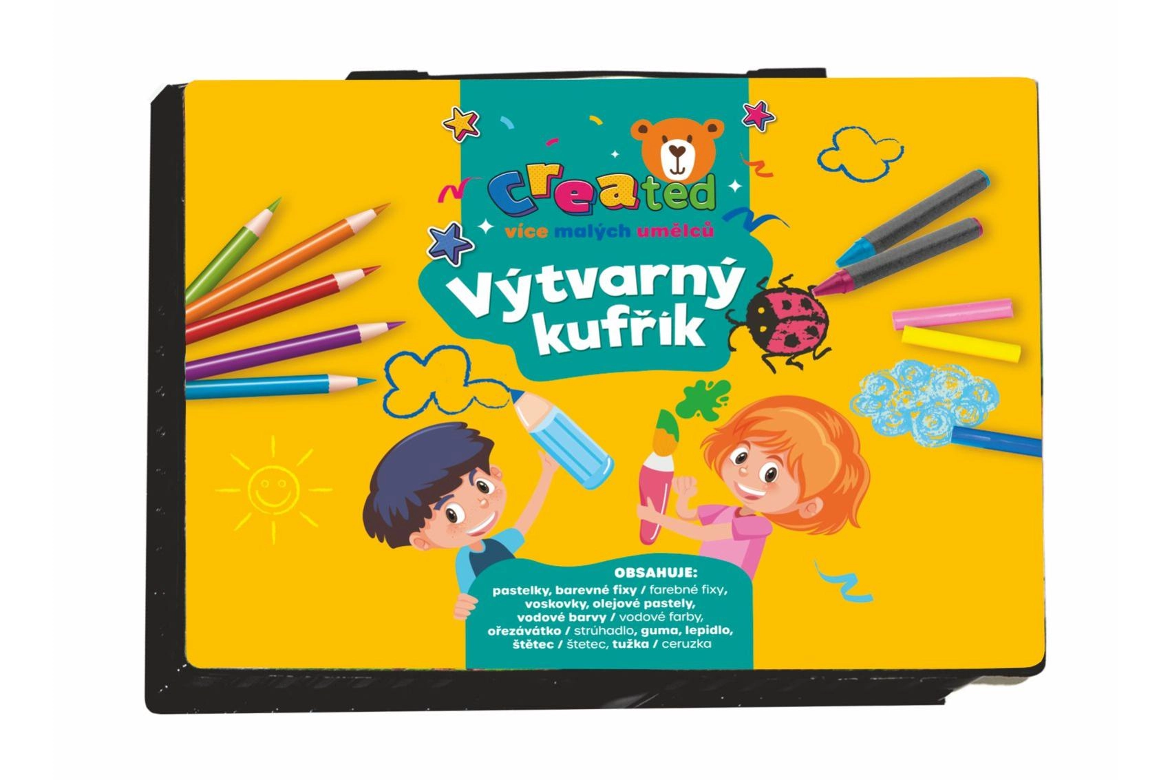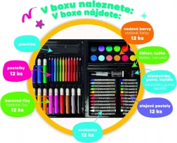 Set creativ practic pentru micii artiști, într-o geantă rezistentă din plastic, oferă tot ce este necesar pentru pictură și desen. Ideal pentru acasă, la grădiniță și în călătorii. Conține o selecție variată de instrumente care dezvoltă imaginația copiilor și motricitatea fină, inclusiv creioane colorate, markere și acuarele.
