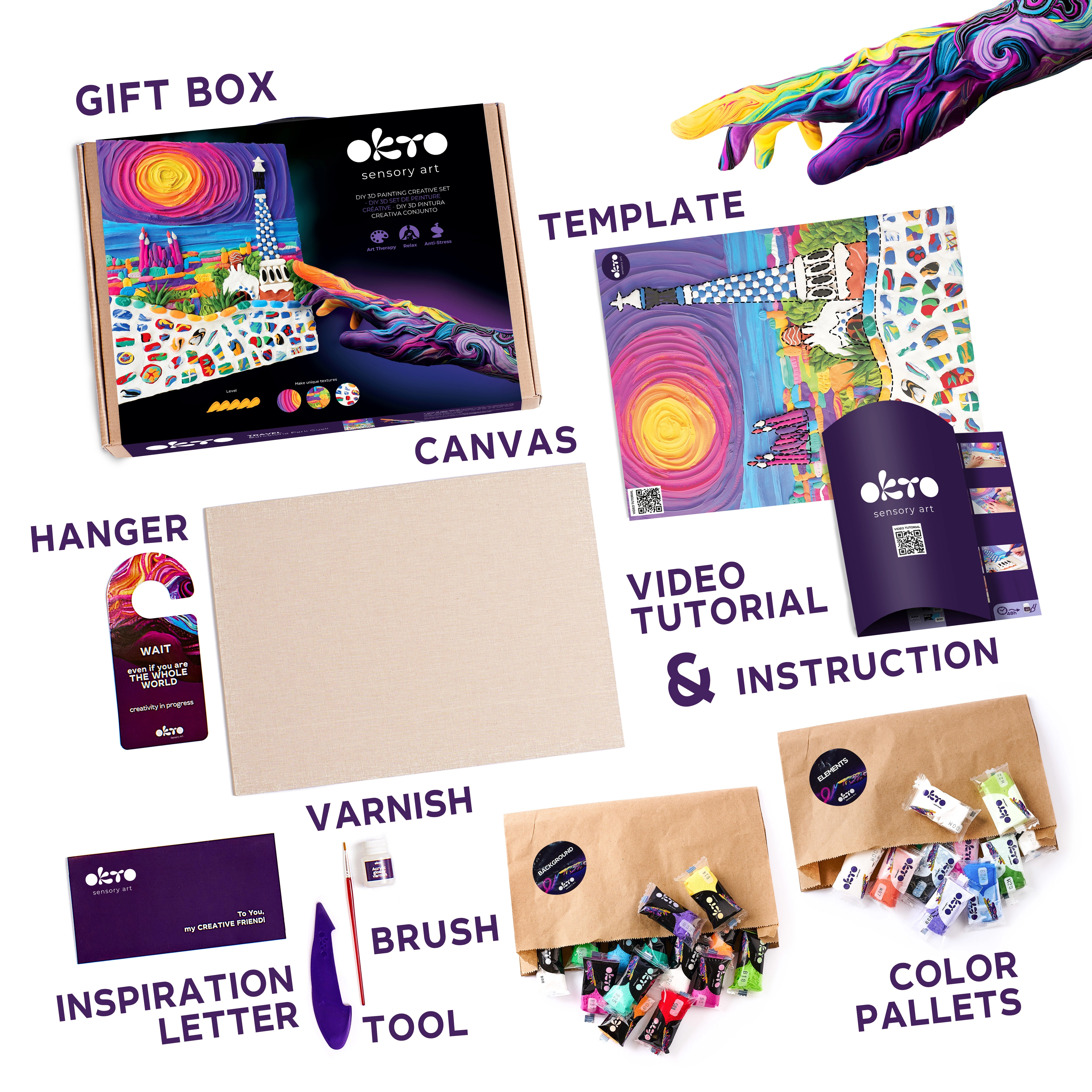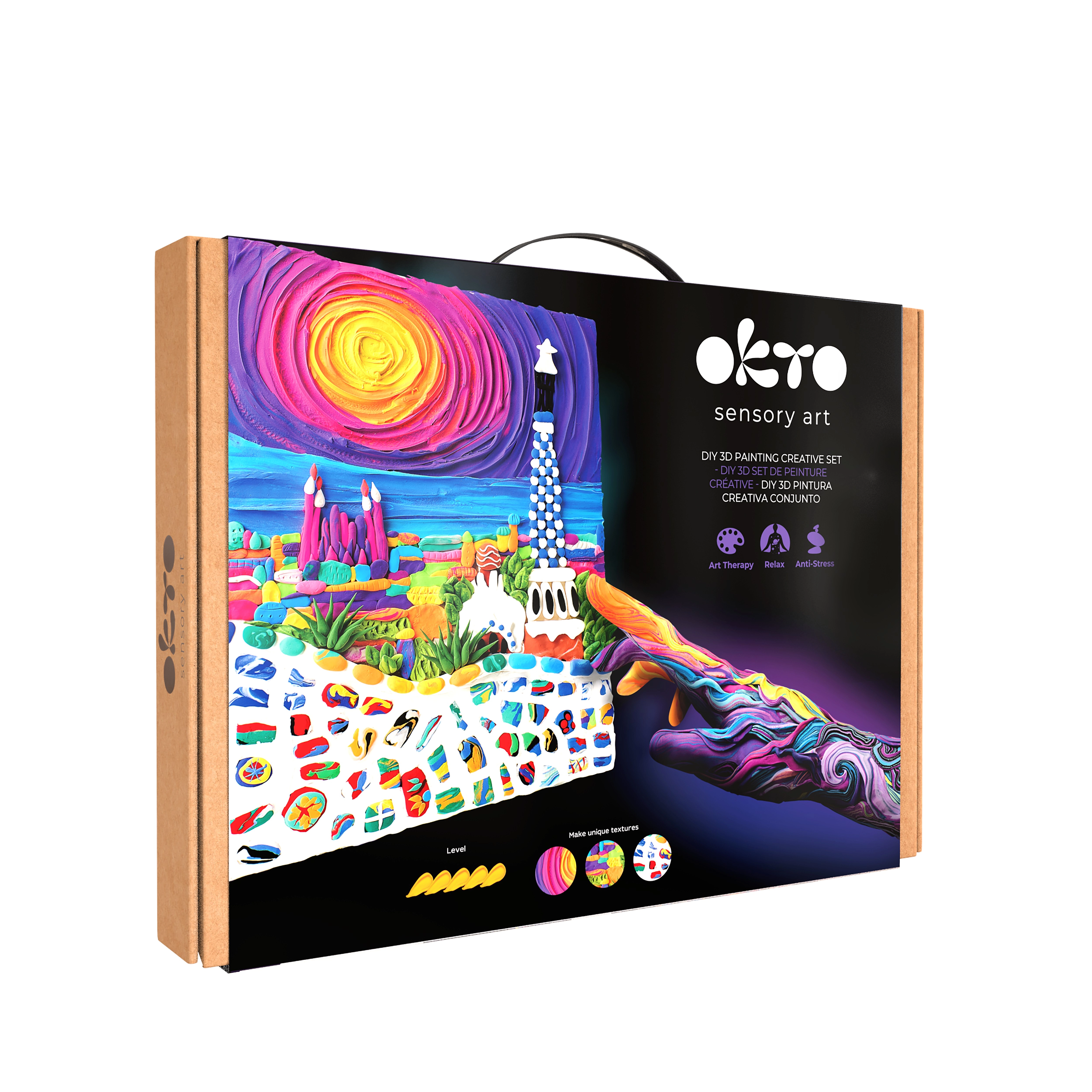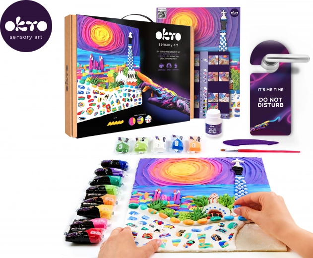 Acest set creativ premium OKTO îți permite să creezi un tablou plastic cu textură unică și detalii jucăușe inspirate de arhitectura Barcelonei. Datorită pastei modelatoare autoîntăritoare vei obține un efect 3D impresionant, care, după lacuirea cu lac acrilic, capătă un aspect deosebit și protecție de durată.