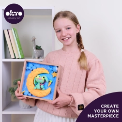 Descoperiți plăcerea modelării cu setul creativ Okto. Urmând instrucțiunile ilustrate incluse, veți modela cu ușurință o scenă 3D fermecătoare în ramă, cu motivul Iepuraș pe lună. Datorită pastei autoîntăritoare nu aveți nevoie de cuptor sau echipamente suplimentare – după uscare, este suficient să acoperiți imaginea cu un strat de lac acrilic pentru un aspect durabil și lucios.