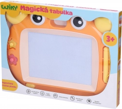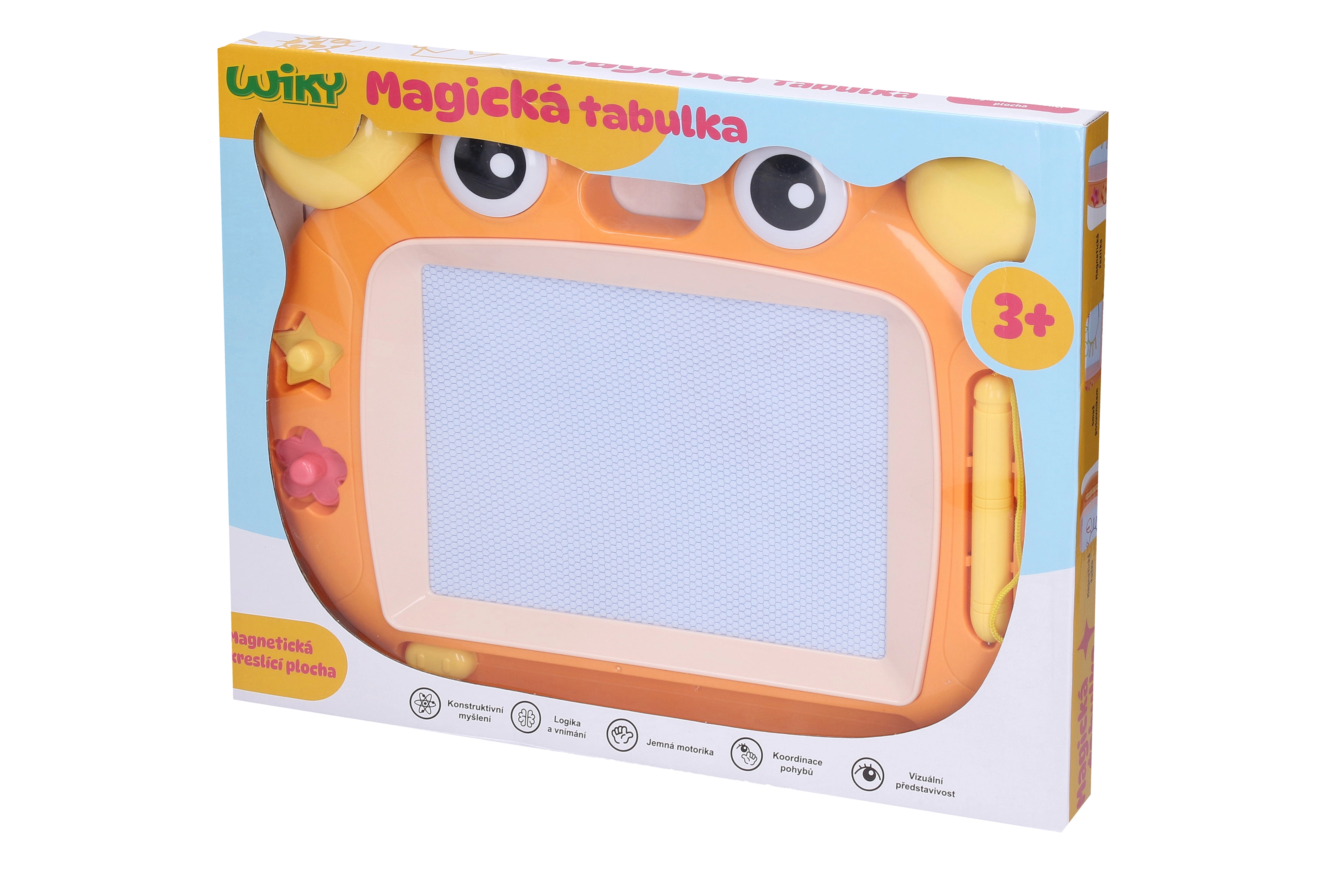 O tăbliță magică de desen de 33 cm cu ambalaj în limba cehă care îi va încânta pe micii artiști. Oferă 2 variante de culoare (roz, portocaliu), un creion pentru desen, ștampile magnetice și ștergere ușoară cu glisor – fără hârtie și fără mizerie.