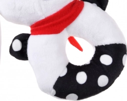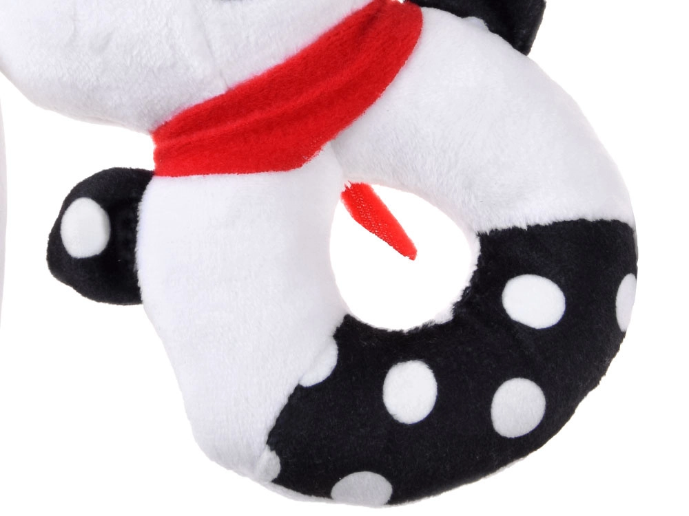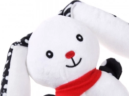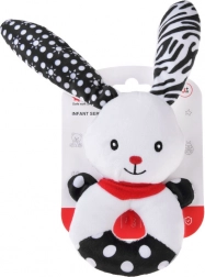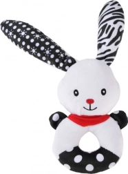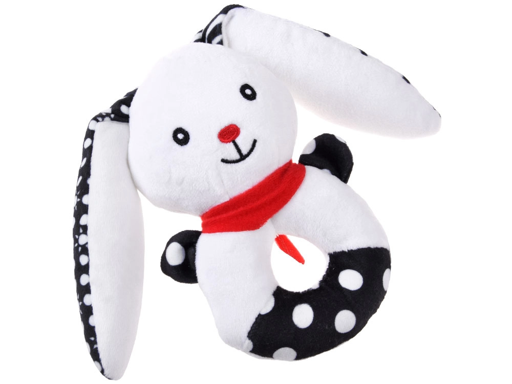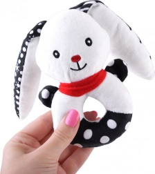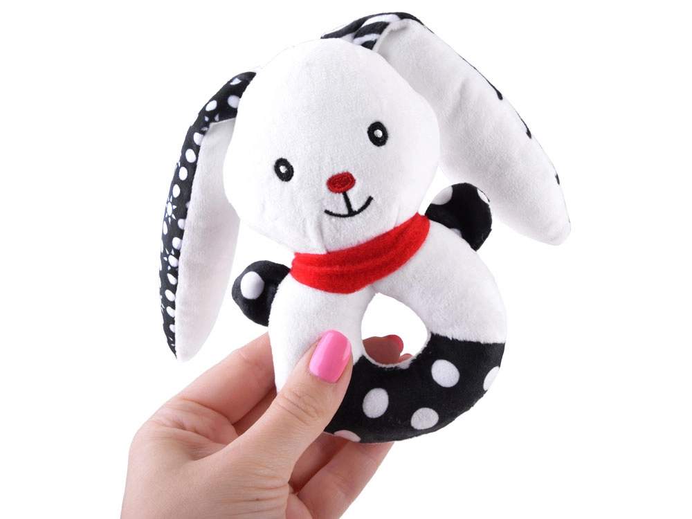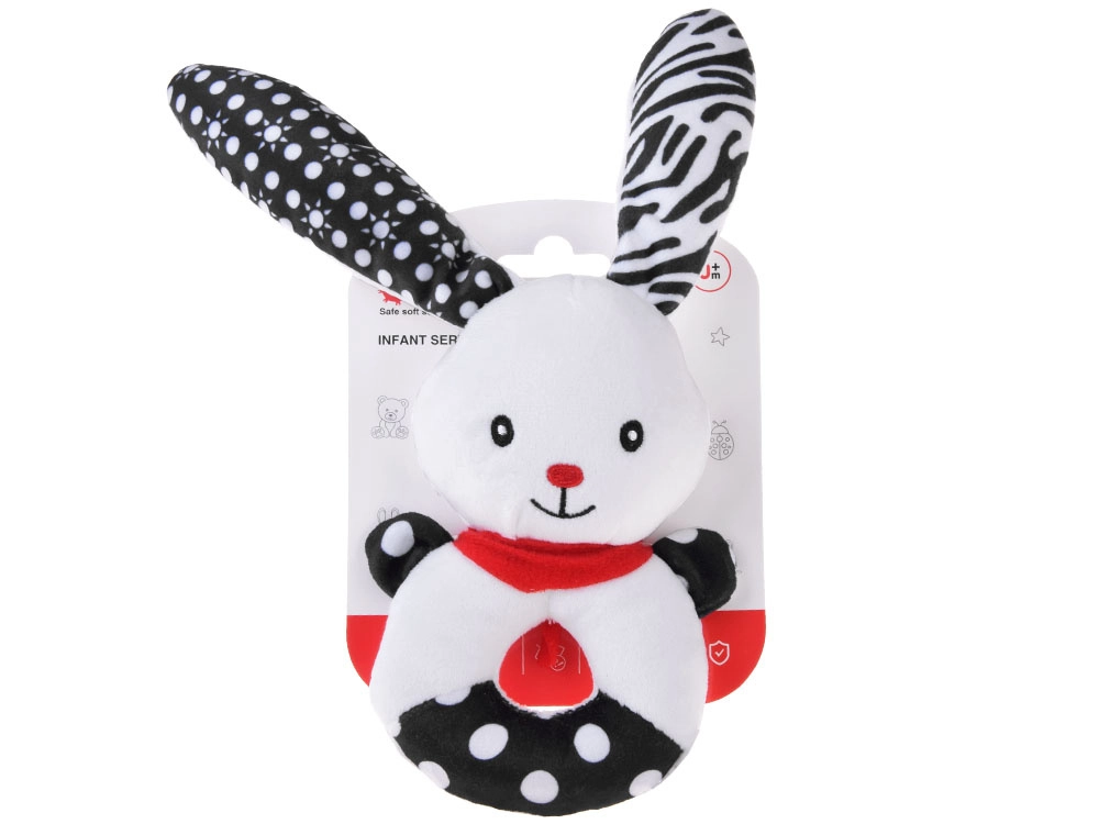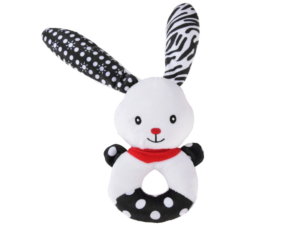 Această jucărie moale cu contrast îmbină funcția de zornăitoare, pîsîitoare și primă jucărie de pluș pentru alint. Forma rotundă, ușor de prins, cu orificiu central, căpșor reliefat și urechi lungi ajută la antrenarea motricității fine și a coordonării mână–ochi. Motivele contrastante alb-negru sunt ușor de văzut pentru bebeluși și le captează atenția.