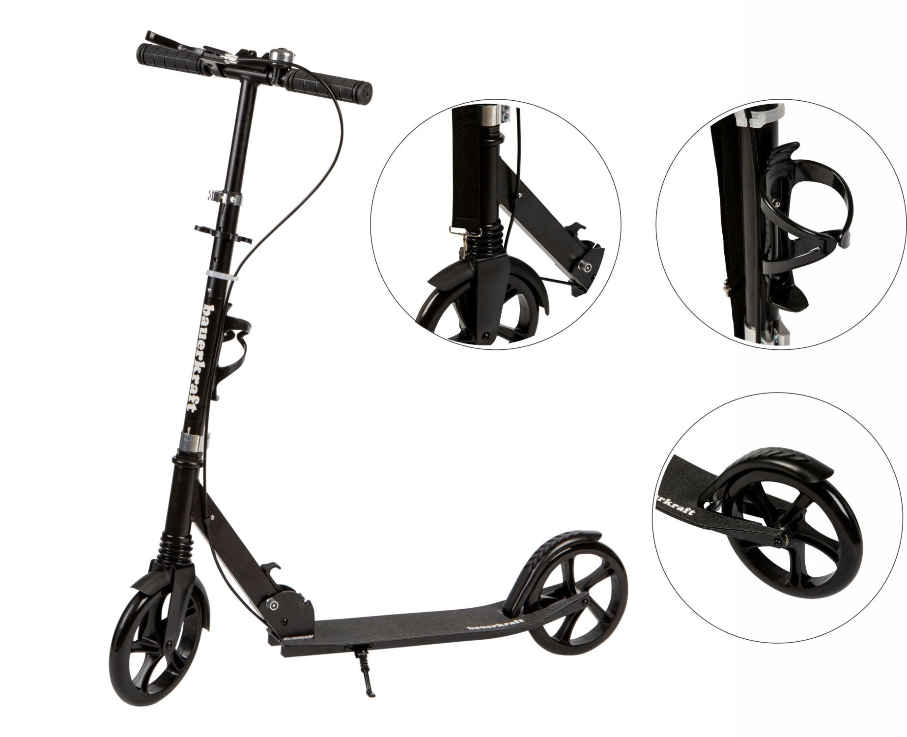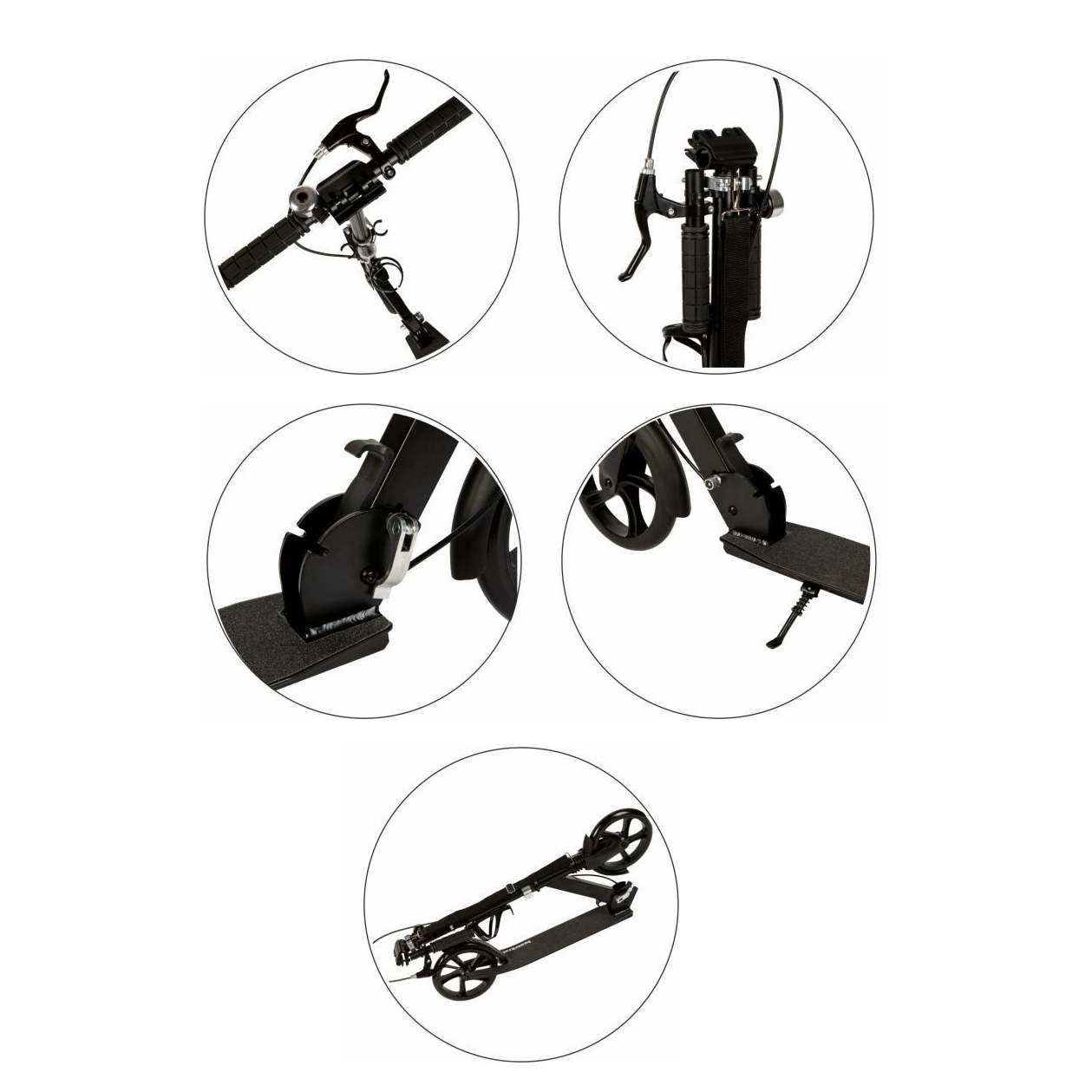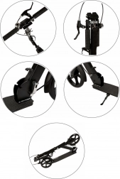 Frâna față de mână și frâna spate la picior oferă oprire sigură, iar mecanismul de pliere cu blocaje permite transport și depozitare ușoare.