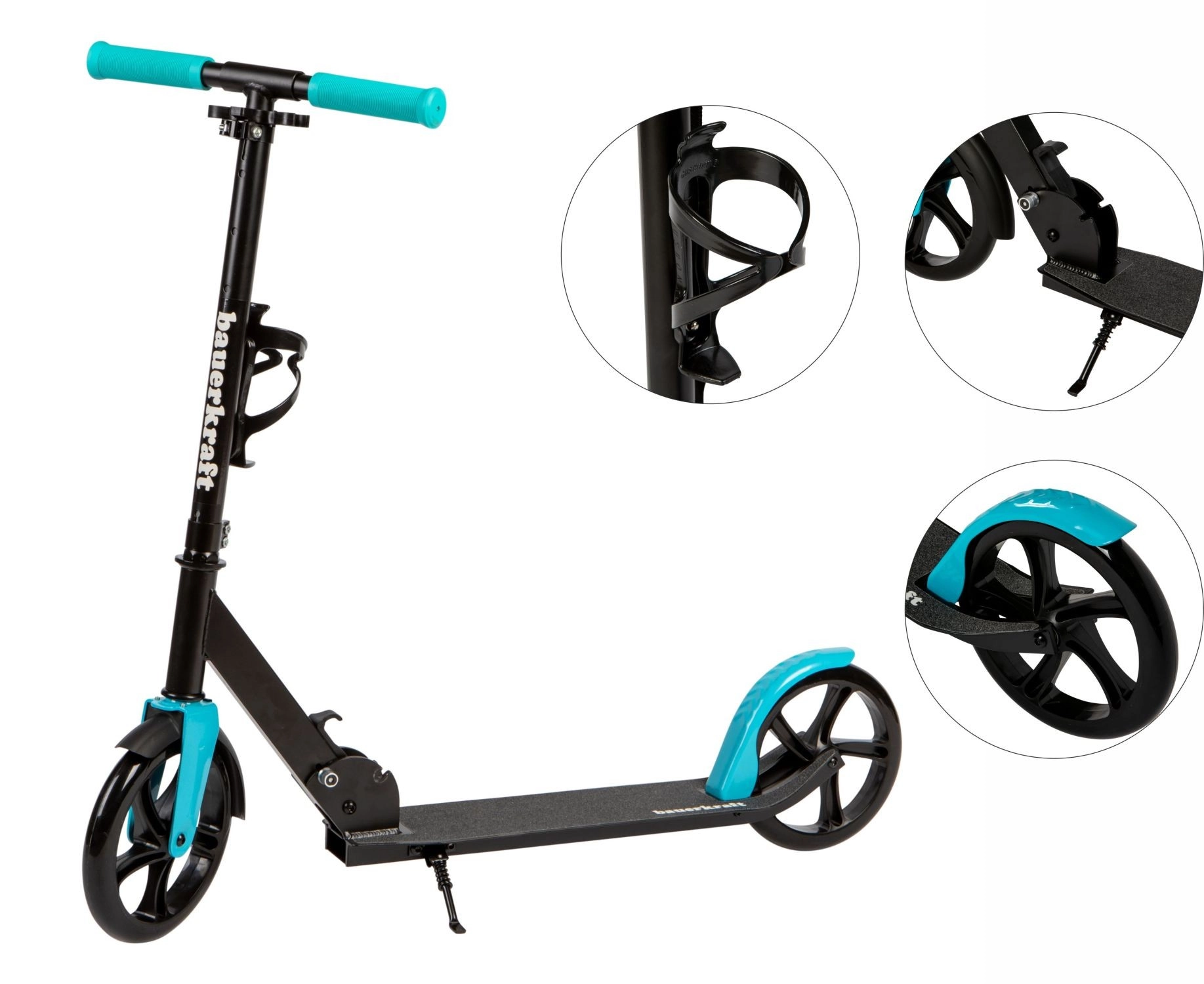 Mânere ergonomice antiderapante, apărătoare spate cu frână, cric integrat și suport practic pentru sticlă pentru plimbări confortabile și sigure.