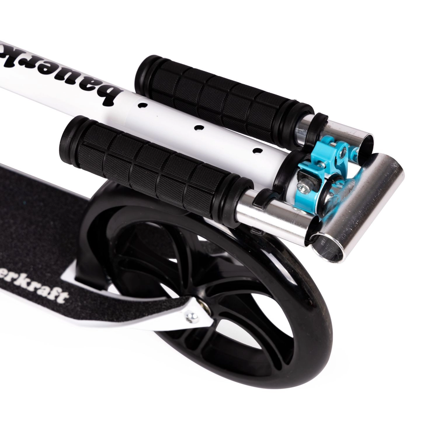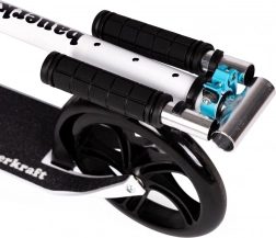 Mecanismul rabatabil cu sistem de siguranță permite plierea trotinetei în câteva clipe. Cricul integrat facilitează parcarea fără sprijin.