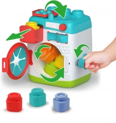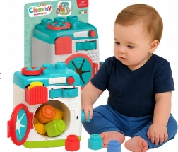 Faceți cunoștință cu jucăria fermecătoare care îmbină acțiunea mecanică interactivă cu cuburile moi Clemmy, sigure. Copiii, rotind rotița laterală, observă efectul de „spălare” și își antrenează natural coordonarea mână–ochi și gândirea logică. Aspectul realist al mașinii de spălat inspiră jocuri de gospodărie.