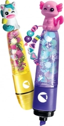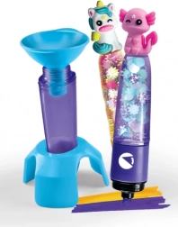 Sunt incluse mai multe cerneluri colorate, corpuri goale de evidențiatoare, mici decorațiuni și instrumente pentru asamblare. Copiii aleg culoarea, umplu markerul, îl decorează cu figurine de animale magice și obțin un accesoriu școlar original.