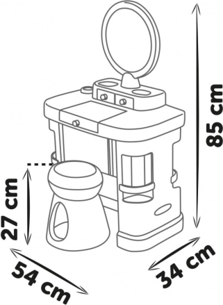 Sunt incluse 15 piese de accesorii – de la „rujuri” cu funcție mecanică, lacuri de unghii și paletă de farduri până la pieptene, perie și ineluș. Toate elementele cosmetice sunt doar imitații, astfel încât joaca este sigură și potrivită pentru copii. Construcția realizată prin suflare asigură rigiditate ridicată și durată lungă de viață. În plus, toaleta se poate reconfigura ușor în variantă de masă pentru economisirea spațiului.