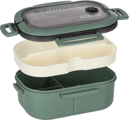 Cutie de prânz practică 1200 ml cu trei compartimente și capac etanș cu 4 cleme păstrează gustarea proaspătă și separată. Include etaj detașabil, furculiță și lingură. Potrivită pentru mașina de spălat vase și cuptorul cu microunde (fără capac), fabricată din plastic fără BPA.