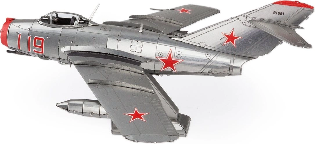 Piesele din oțel inoxidabil sunt fin gravate cu laser, creând panouri și embleme fidele. Rezultatul este un model metalic MiG‑15 captivant, cu aspect autentic.