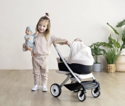 Descoperă un cărucior modern și versatil pentru păpuși, care crește odată cu jocul copilului. Datorită construcției inteligente, îl transformi în câteva clipe din landou în versiunea sport. Partea superioară se poate detașa ușor, iar bebelușul poate fi transportat într-un coș practic – ideal pentru călătorii și pentru camera copilului.