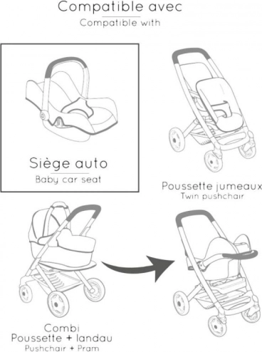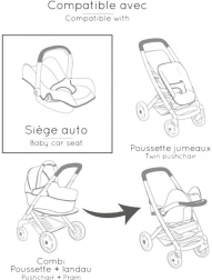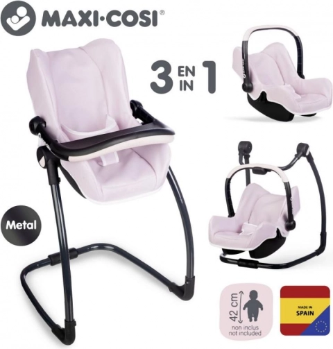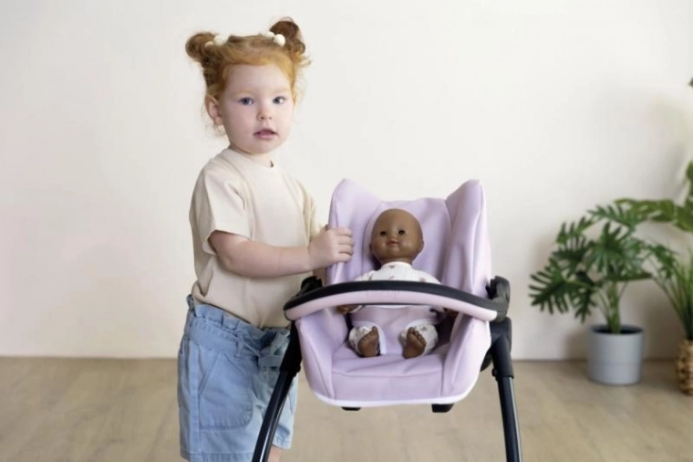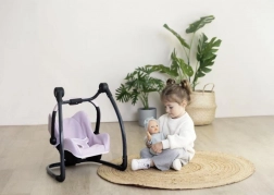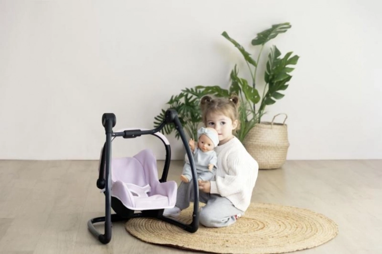 Acest set ingenios 3-în-1 transformă îngrijirea păpușilor într-un joc realist și distractiv. Scaunul auto se agață ușor în cadru și devine imediat un leagăn delicat. Prin rotirea construcției obții un scaun de masă înalt cu tăviță – ideal pentru hrănirea păpușilor de până la 42 cm. Construcția robustă și căptușeala moale asigură confortul păpușii și stabilitate la joaca de zi cu zi.