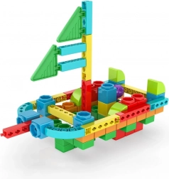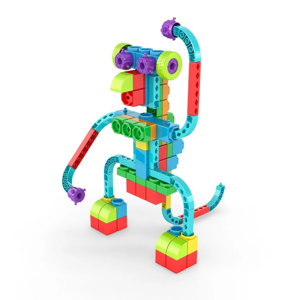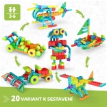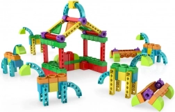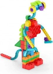 Setul mare de blocuri și conectori colorați stimulează imaginația și motricitatea fină. Copiii construiesc cu ușurință animale, personaje și mașinării.