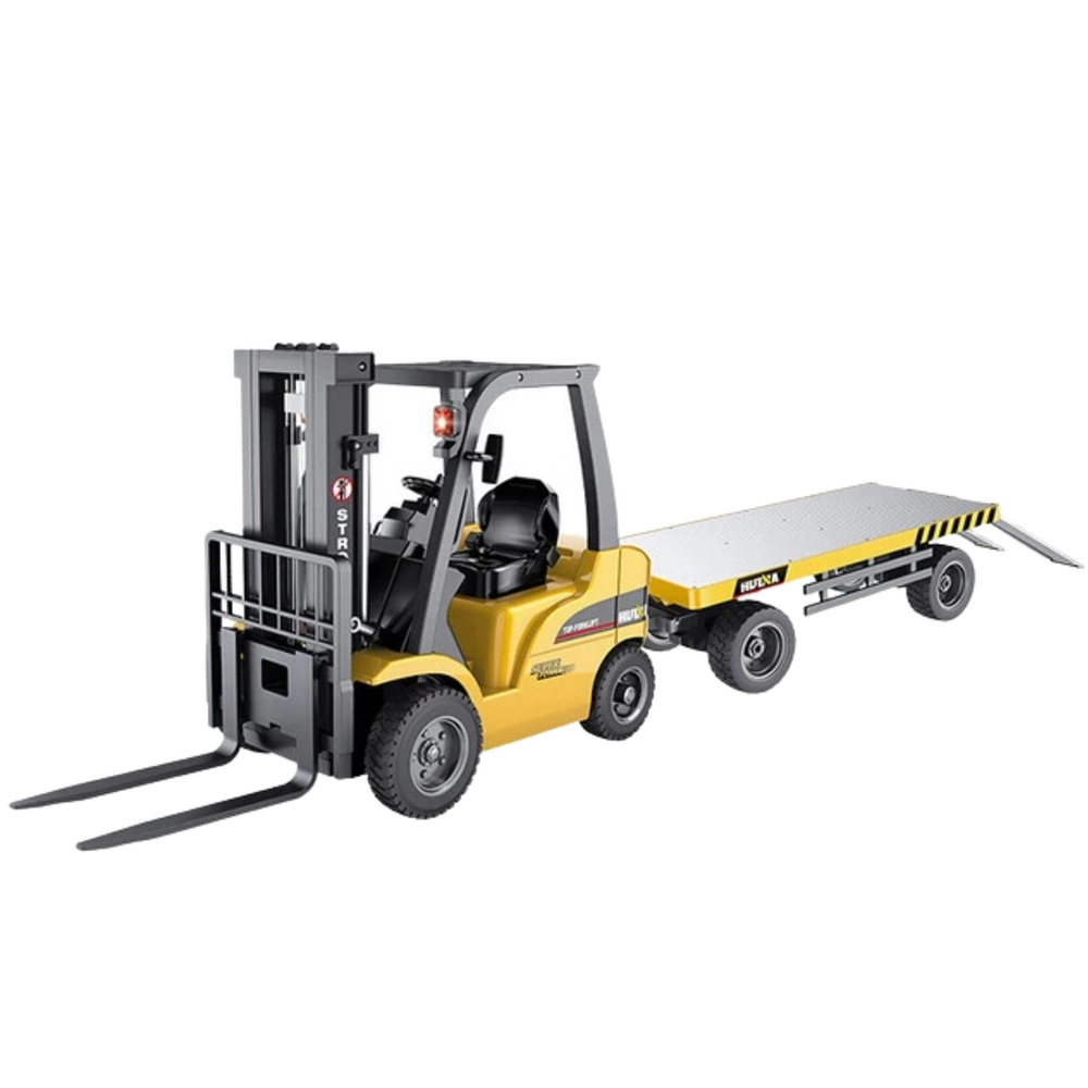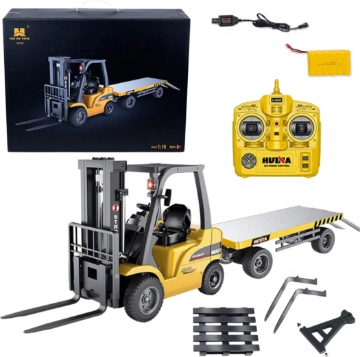 Stivuitor realist cu remorcă la scară 1:10 care va încânta atât copiii, cât și adulții pasionați de tehnică. Oferă control complet la distanță, furci de ridicare și coborâre, efecte luminoase și sonore și construcție solidă pentru ore îndelungate de distracție.