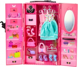 Acest set bogat echipat include o păpușă cu înălțimea de 30 cm și un dulap roz cu uși deschise, oglindă și rafturi de depozitare. Datorită selecției variate de haine și accesorii, păpușa poate fi pregătită cu ușurință pentru orice ocazie – de la plimbare până la o seară elegantă.