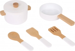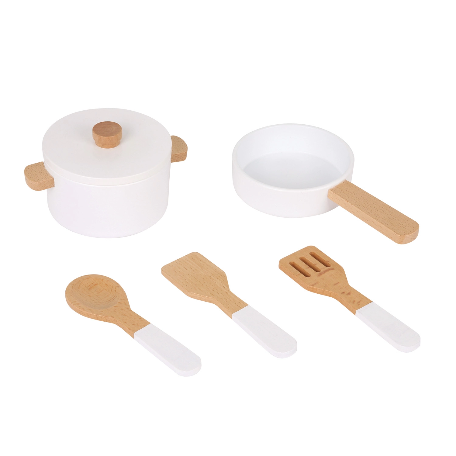 Setul include tot ce au nevoie micii bucătari: chiuvetă aurie cu robinet, plită cu butoane rotative, cuptor cu uși transparente, 3 ustensile de bucătărie din lemn, prosop, solniță, piperniță și două oale cu capac. Material din lemn 100% certificat FSC pentru un joc sigur și sustenabil.