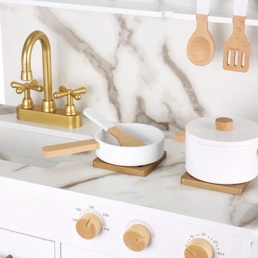 Această bucătărie modernă din lemn le oferă copiilor o experiență autentică a gătitului într-o execuție sigură și estetică. Aspectul marmorat al blatului și al panoului de fundal conferă bucătăriei un design premium, care se potrivește perfect atât în camera copilului, cât și în living. Copiii pot găti, amesteca, coace și spăla vase, imitând astfel adulții din gospodărie.