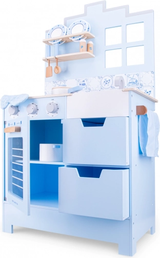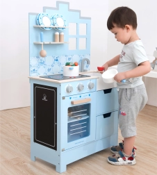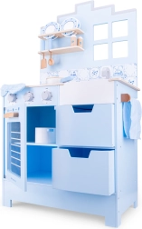 Această bucătărie elegantă pentru copii, în albastru deschis, creează spațiul ideal pentru jocul imaginar de-a gătitul. Nu lipsesc chiuveta cu robinet, cuptorul cu geam, cuptorul cu microunde și o serie de rafturi și sertare practice pentru depozitarea accesoriilor. Detaliile realiste, precum butoanele rotative, ușa cuptorului și ustensilele suspendate, stimulează percepția senzorială și îi conduc natural pe copii spre independență.