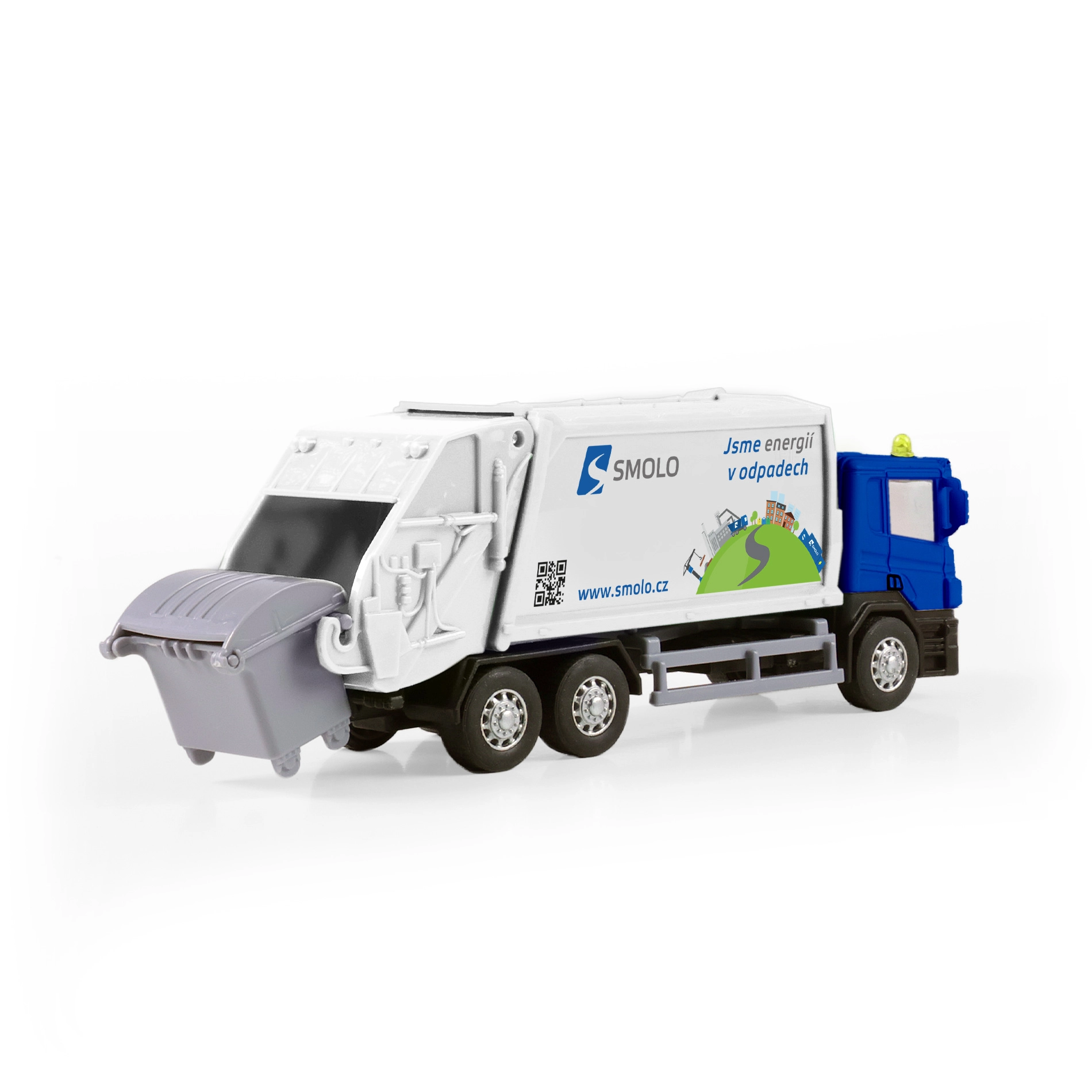 Mașina de gunoi realistă cu logo-ul SMOLO îi va încânta pe micii pasionați de tehnică și pe colecționari. Oferă cabină metalică, benă din plastic cu uși spate rabatabile, pubelă cu capac deschizibil și mecanism de întoarcere (pull-back). Lungimea compactă de 15 cm este ideală pentru joacă acasă și în călătorii.