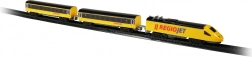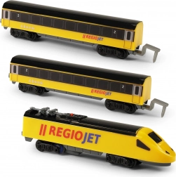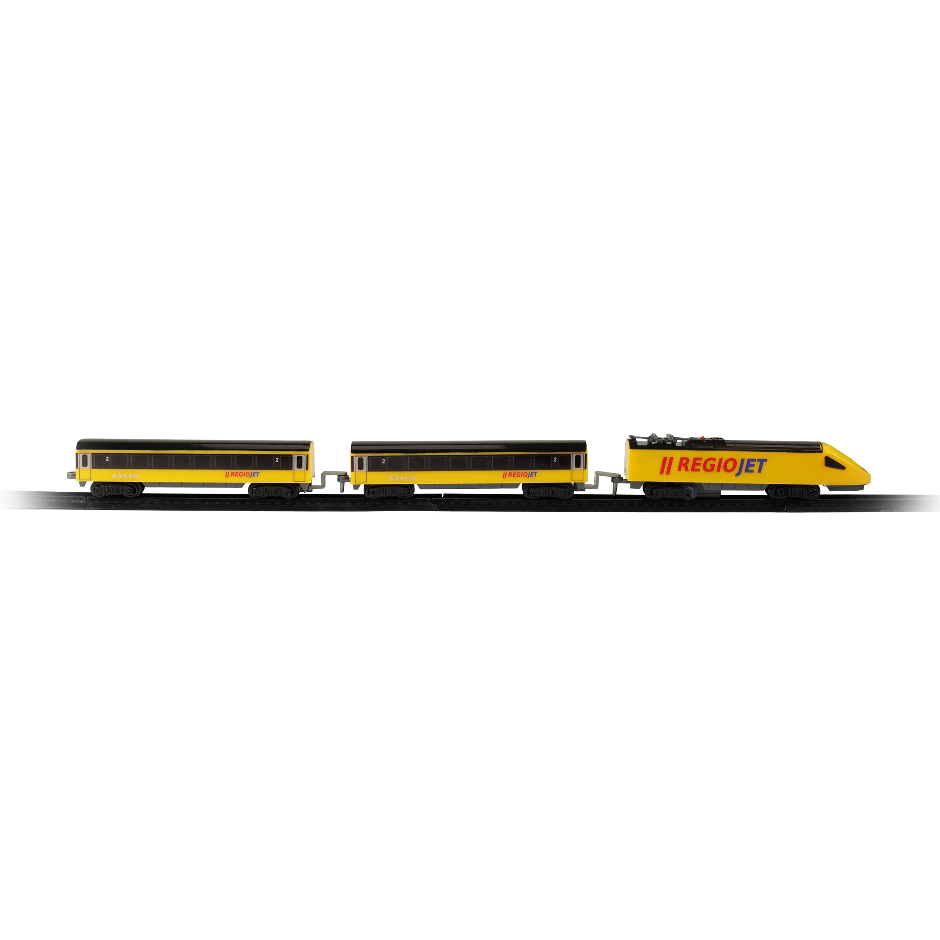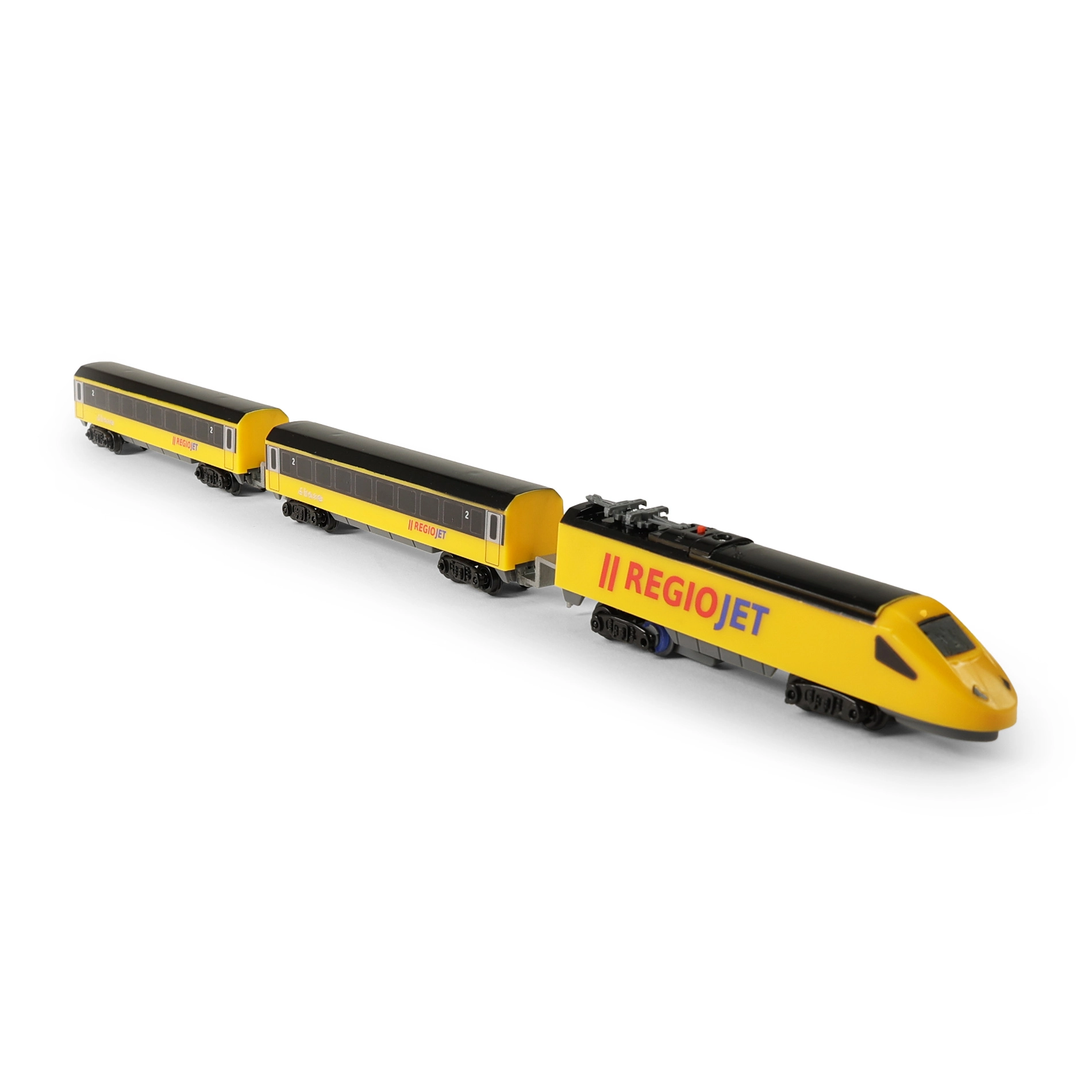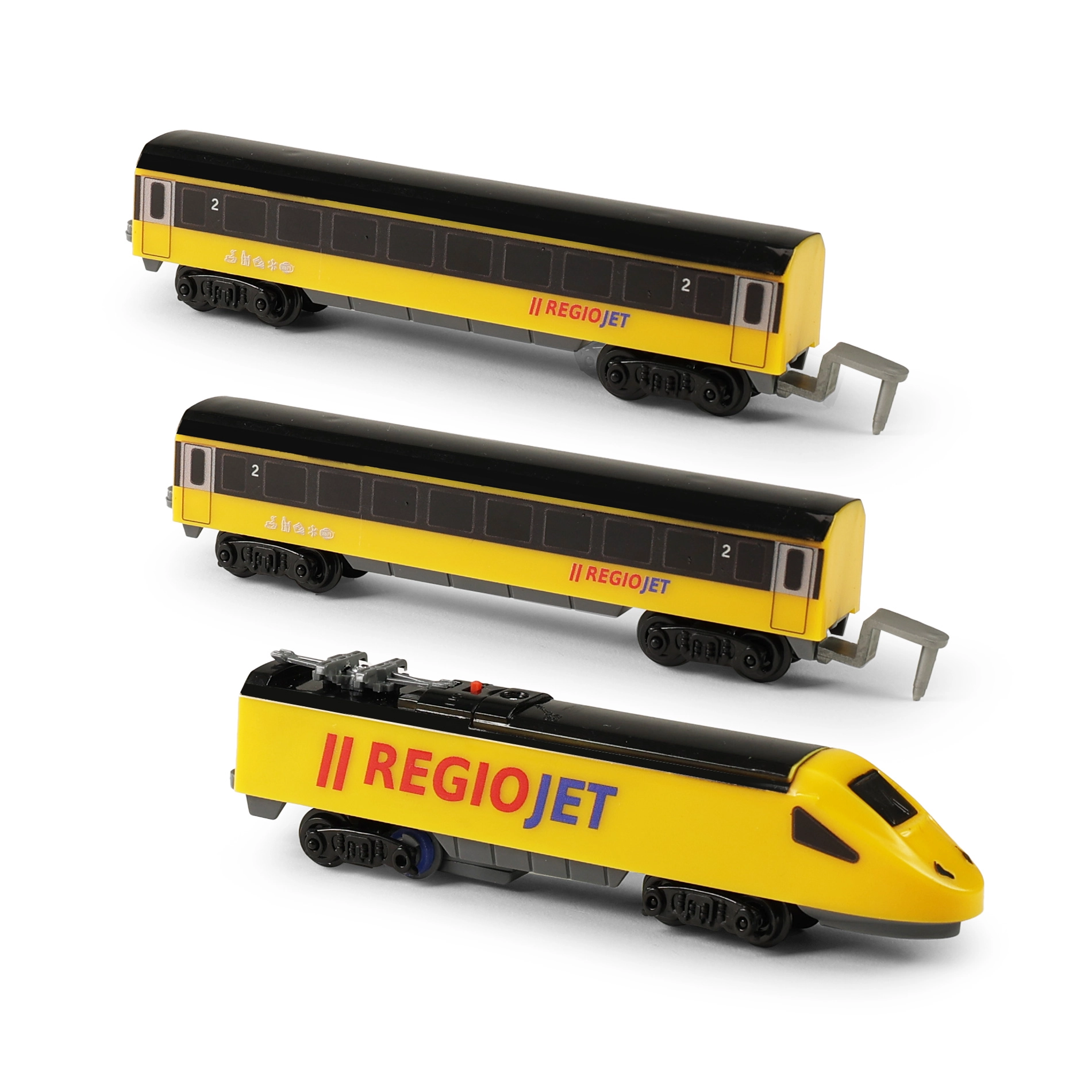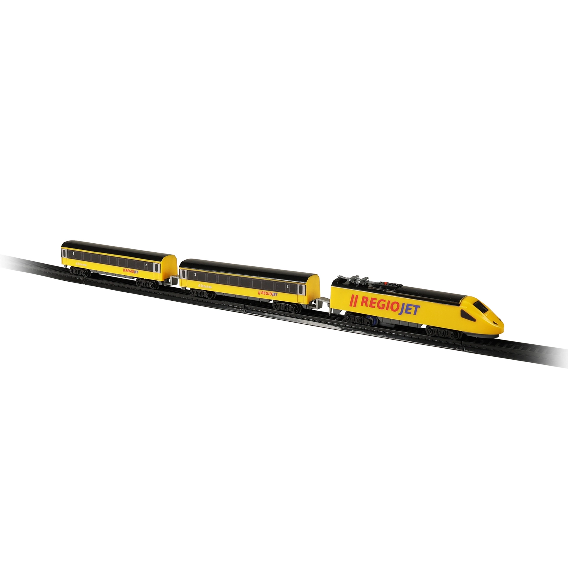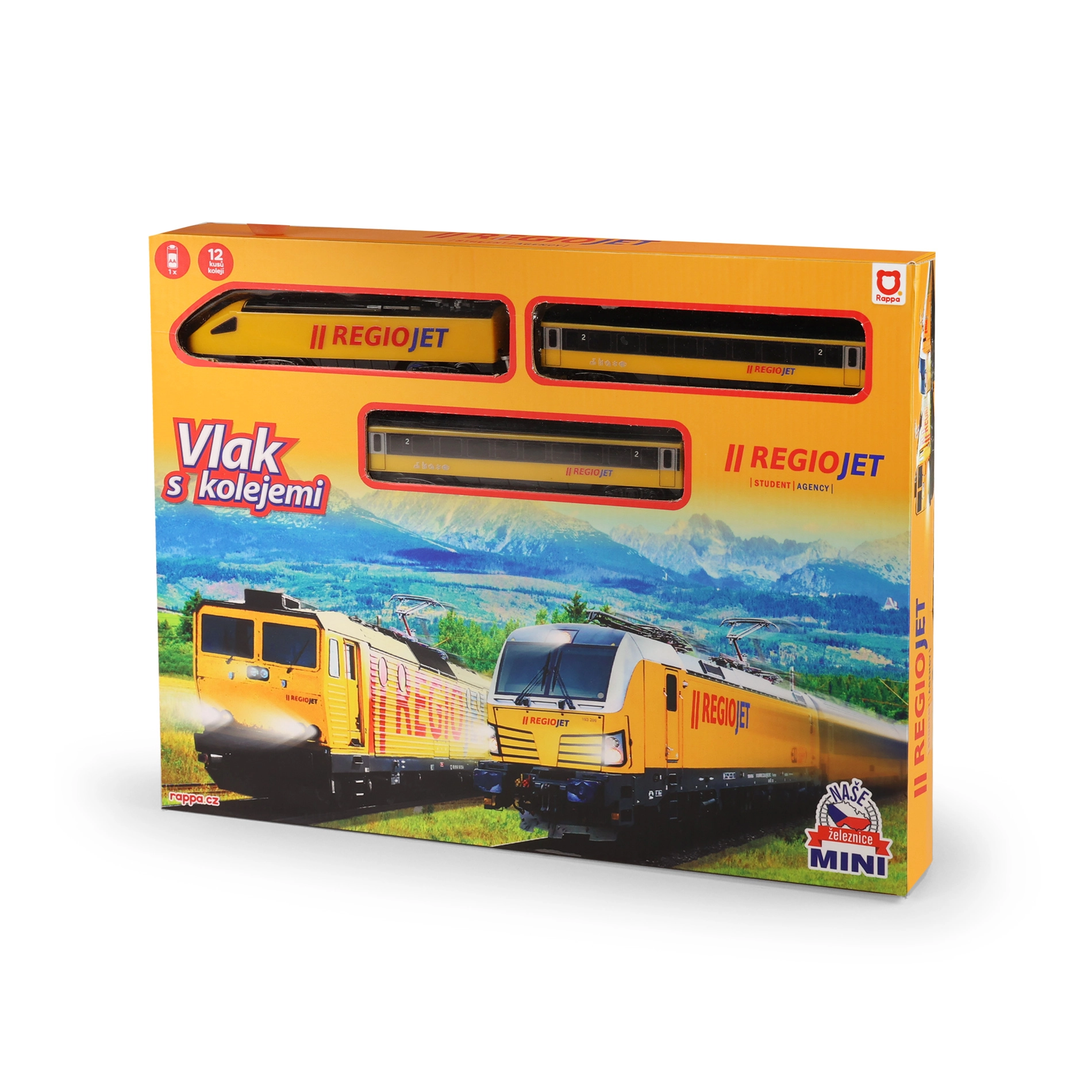 Descoperă distracția trenulețelor cu setul compact RegioJet MINI. Locomotiva galbenă cu două vagoane rulează pe o cale ferată modulară pe care o asamblezi ușor din 8 piese curbe și 4 drepte. Datorită comutatorului practic de pe acoperișul locomotivei, controlul este extrem de simplu, astfel încât copiii pot începe joaca imediat.