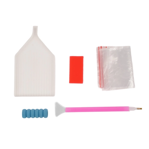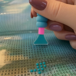 Tăvița striată, aplicatorul și ceara asigură preluarea și plasarea precisă a pietricelelor în locurile corecte conform simbolurilor de pe pânză.