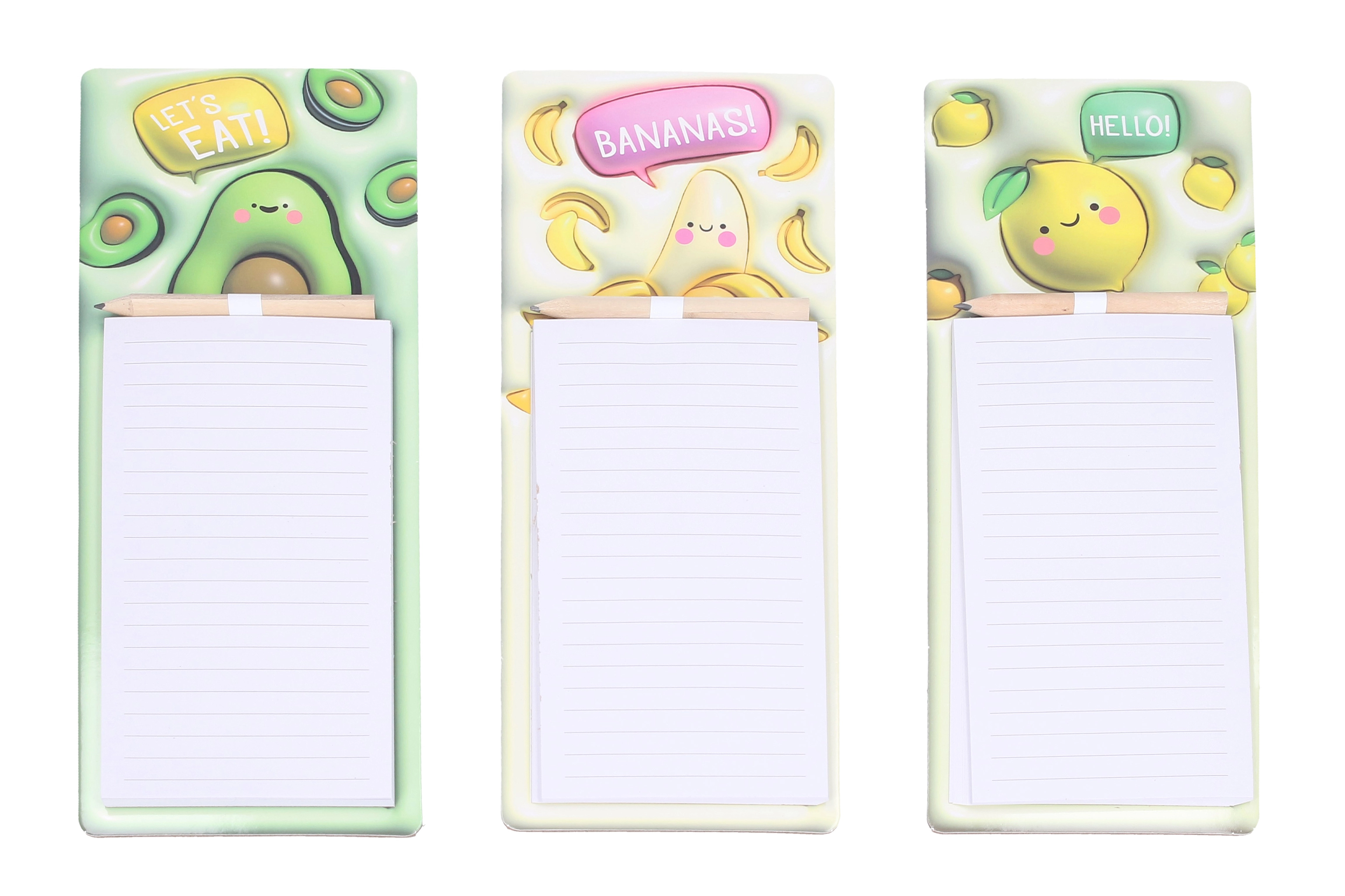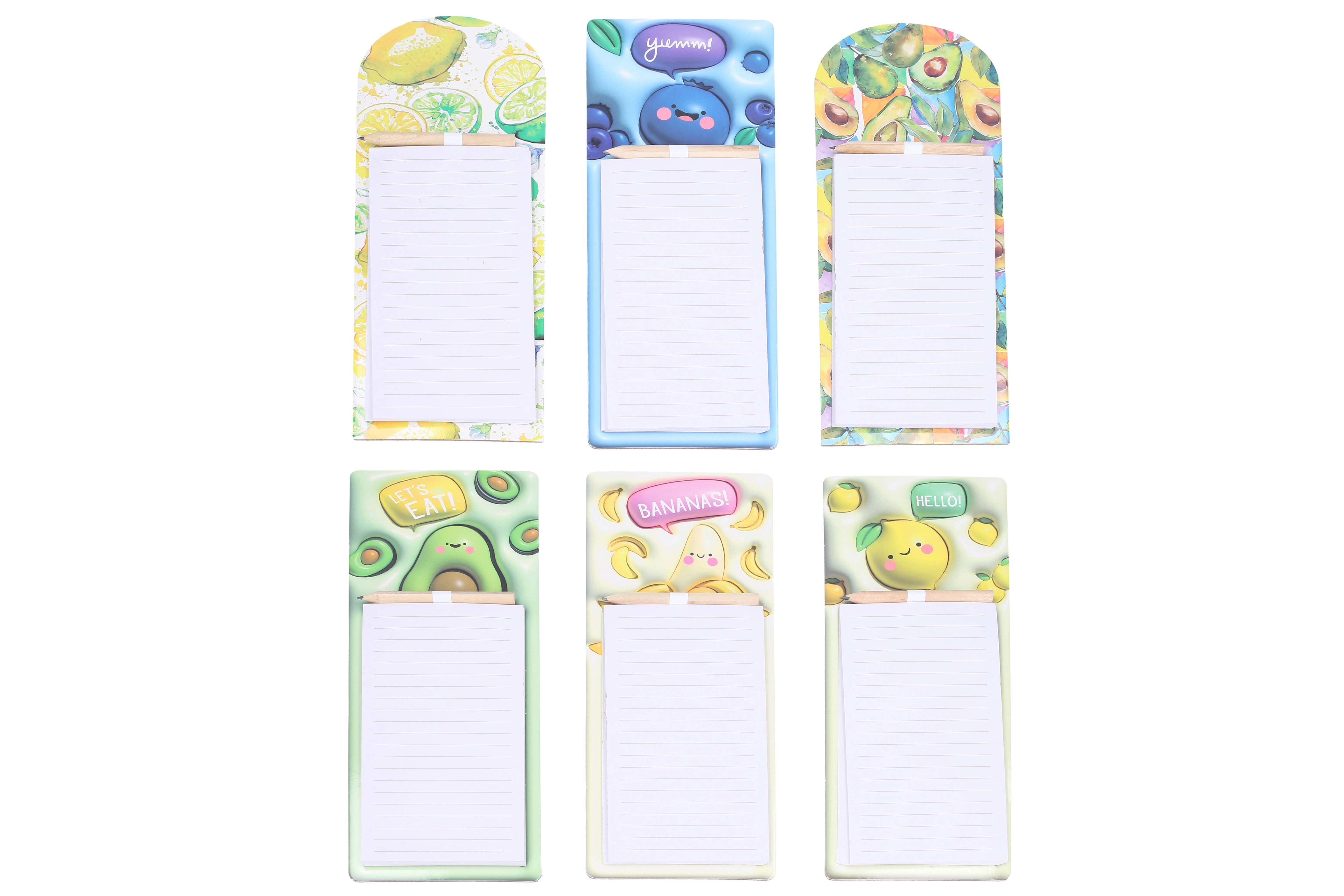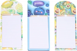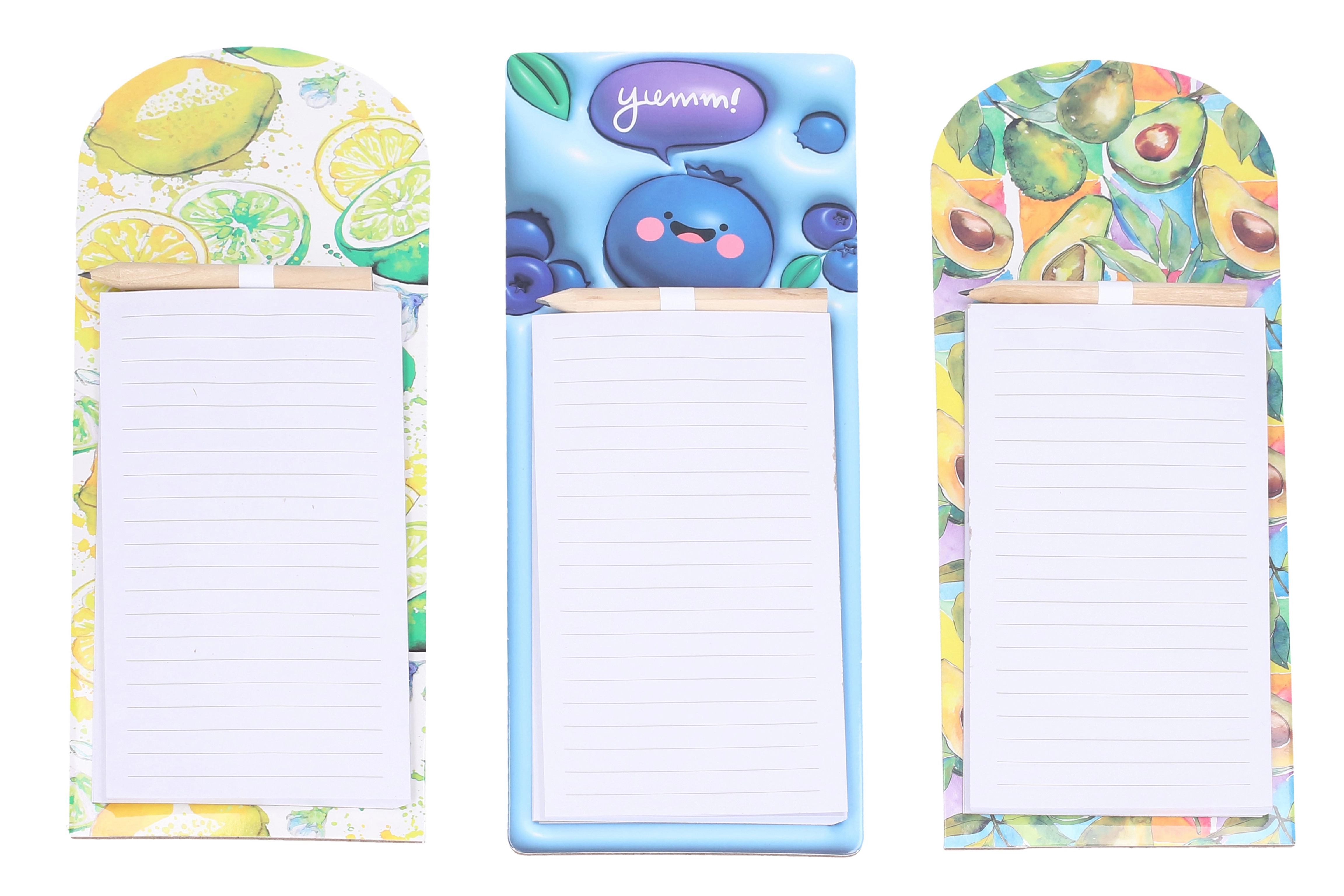 Pune ordine în cumpărături și în sarcinile zilnice cu carnete magnetice cu motive fructate vesele. Datorită magnetului puternic, le fixezi ușor pe frigider sau pe alte suprafețe metalice, astfel încât să fie mereu la îndemână. Este inclus un creion practic, prins în partea superioară, ca să poți scrie oricând, fără să cauți.