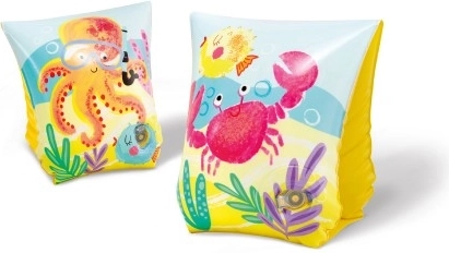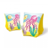 Aripioarele au ilustrații jucăușe cu meduze, caracatițe și crabi în culori vibrante pe un fundal galben, ceea ce îndeamnă copiii să înoate.