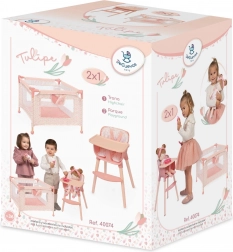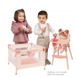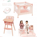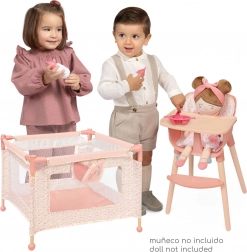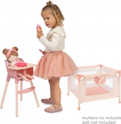 Setul include un țarc de joacă stabil, cu laterale din plasă și buzunar practic pentru mărunțișuri, precum și un scăunel de hrănire cu tăviță detașabilă și centură în trei puncte pentru fixarea sigură a păpușii. Ambele produse sunt concepute pentru păpuși de până la 36 cm și se remarcă prin manipulare ușoară și întreținere facilă.