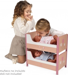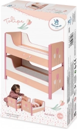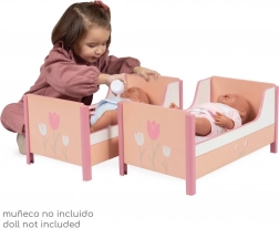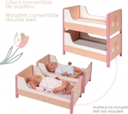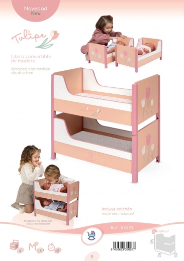 Oferiți-le copiilor o scenă frumoasă pentru păpușile lor preferate. Pătuțul 2 în 1 din colecția Tulipe, în tonuri calde de somon, cu un model floral stilat, permite atât dormit suprapus, cât și separarea în două paturi individuale. Design spaniol precis și construcție solidă din MDF și lemn masiv asigură durabilitate îndelungată și joacă în siguranță.