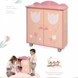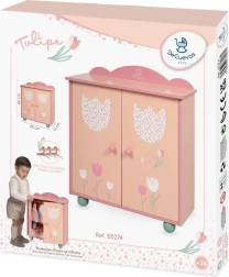 Un dulap din lemn pentru păpuși, stilat, din colecția TULIPE, încântă prin designul pastelat delicat, execuția precisă și organizarea practică a interiorului. Include o bară pentru umerașe și 3 umerașe din lemn pentru depozitarea ordonată a hăinuțelor. Un accesoriu grozav pentru camera fetiței, ideal pentru copii de la 3 ani.