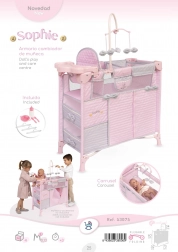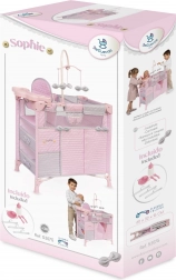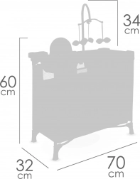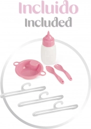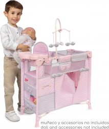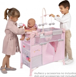Include o dotare bogată pentru îngrijire realistă a păpușilor: carusel cu fundițe, măsuță de înfășat, scaun de masă cu set din plastic, dressing spațios cu fermoar și umerașe și două rafturi de depozitare. Pătuțul are o fereastră din plasă pentru o supraveghere mai bună și ventilație.