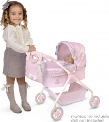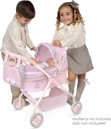 Echiparea practică include o geantă detașabilă pentru cărucior sau de purtat în mână, husă pentru landou cu ochiuri și buzunărașe, o saltea confortabilă și spațiu de depozitare inferior pentru mărunțișuri. Designul spaniol și execuția precisă asigură o durată de viață îndelungată și bucurie în joacă zi de zi.