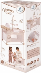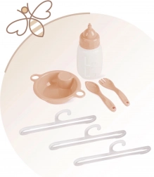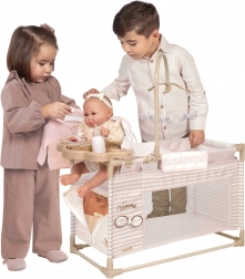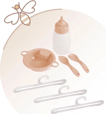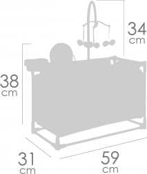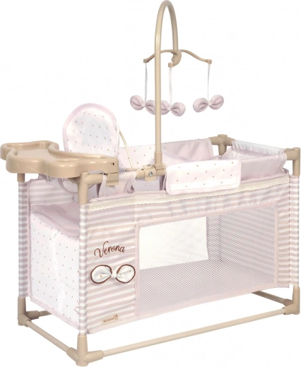 Pachetul include tot ce au nevoie micile mămici: carusel pentru a distra păpușa, măsuță de înfășat pentru îngrijire, scăunel de masă cu biberon, bol și tacâm și dulăpior practic cu fermoar și umerașe. Partea de pat cu fereastră din plasă le permite copiilor să aibă păpușa mereu la vedere, iar baza spațioasă asigură confort în timpul jocului.