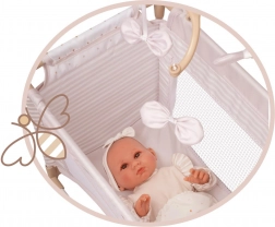 Acest pătuț elegant pentru păpuși, în tonuri pastel de bej și alb, completează cu stil orice cameră de copil. Combină aspectul natural cu detalii drăgălașe, precum bulinele, dungi fine și fundițe discrete ce amintesc de petalele florilor. Datorită execuției de calitate și construcției stabile, joaca este sigură și confortabilă.