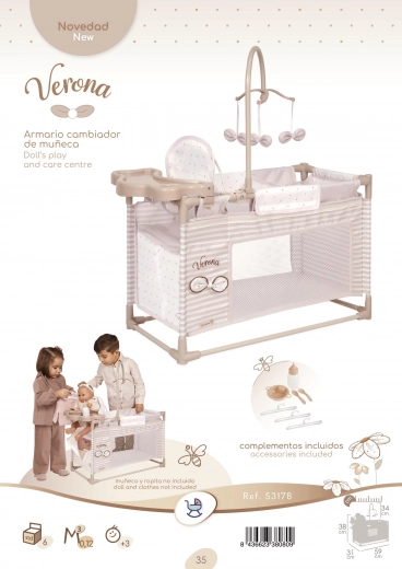 Pătuțul stilat pentru păpuși din colecția VERONA încântă prin accesoriile bogate și designul natural, delicat. Oferă un carusel cu fundițe, un măsuță de înfășat, o scăunel de masă cu set și un dulăpior practic cu fermoar. Datorită execuției precise și manipulării ușoare, este ideal pentru copiii de la 3 ani.