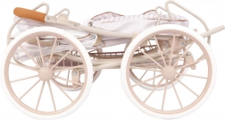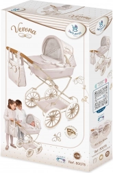 Colecția Verona impresionează prin combinația delicată de bej deschis și alb, cu dungi și buline discrete, completate de fundițe elegante și mici broderii. Căruciorul este proiectat pentru transport confortabil al păpușilor și manevrare ușoară, putând fi pliat simplu pentru economisirea spațiului.