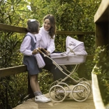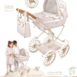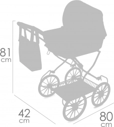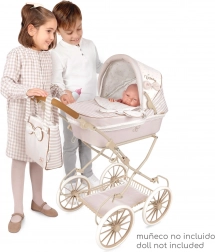 Landou capitonat, capotină pliabilă și husă cu capse care păstrează păpușa în siguranță și confort. Stilul este completat de geanta detașabilă în design asortat.