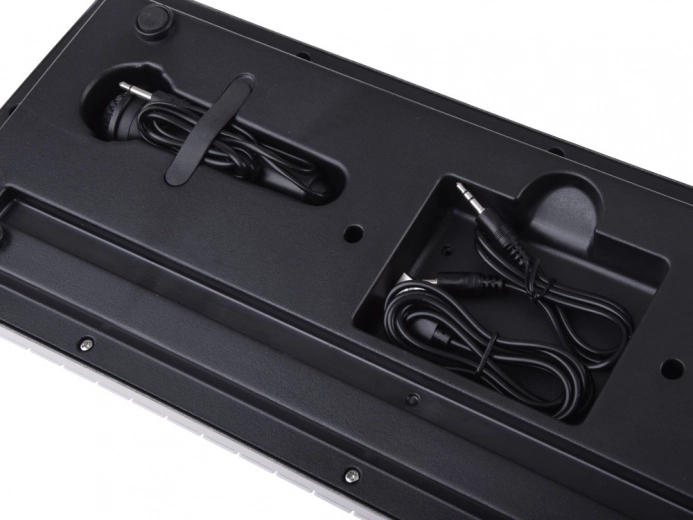 Alege dintre 8 tonuri și 8 ritmuri de acompaniament, pornește 6 piese demo pentru învățare sau adaugă energie aranajamentelor cu 4 efecte de tobe. Prin AUX IN conectezi telefonul sau playerul și, cu microfonul inclus, te bucuri de karaoke acasă.