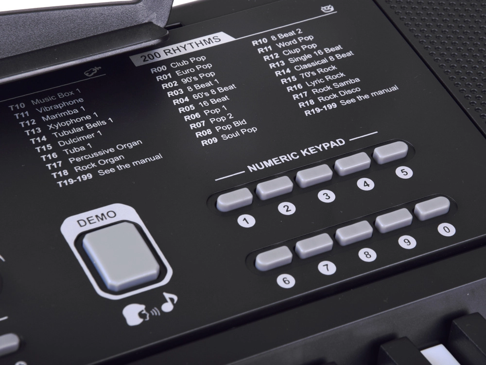 Poți alege dintre 200 de sunete (piane, orgi, coarde, suflători și sintetizatoare moderne) și 200 de stiluri de acompaniament, de la pop și rock până la jazz și disco. Nu lipsesc 70 de piese demo pentru inspirație și învățare, funcția Record/Play pentru înregistrarea ideilor proprii și Numeric Pad pentru introducere numerică rapidă.
