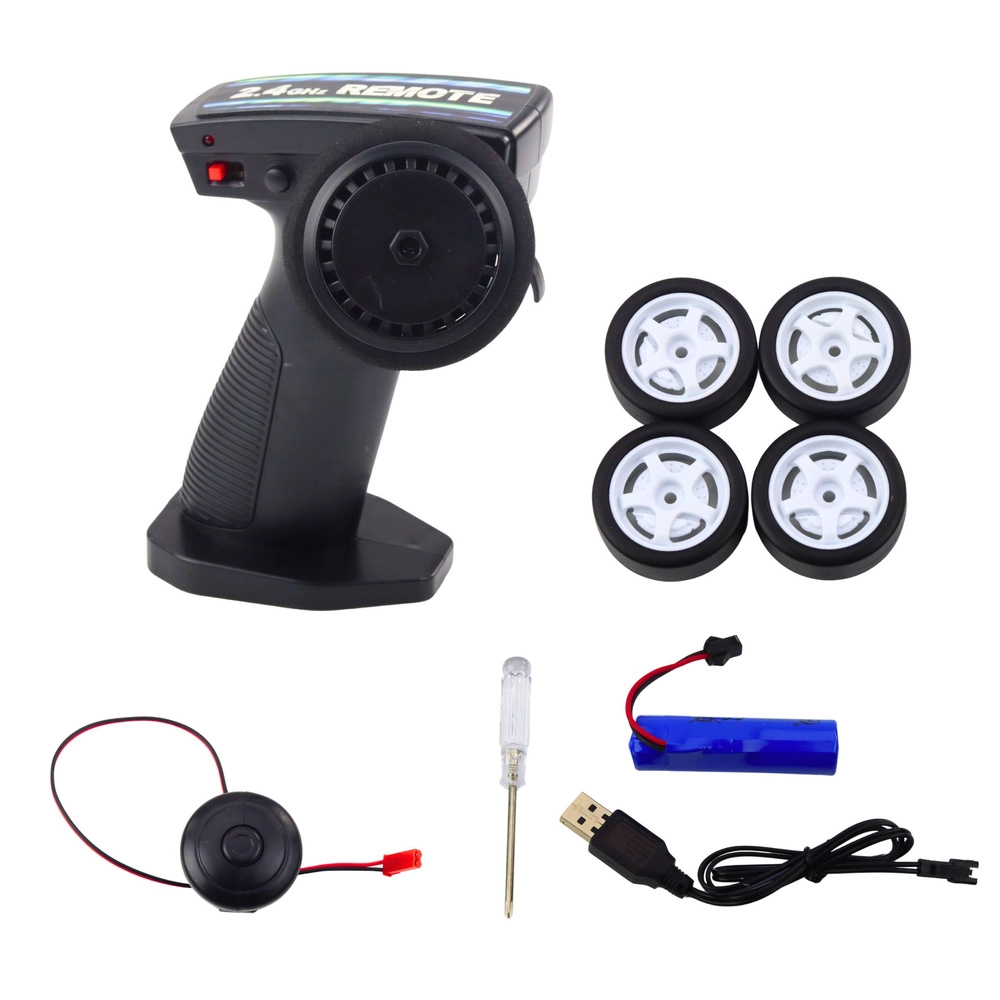 - Mașină RC, acumulator 7.4V Li, cablu de încărcare USB, set de roți pentru drift, telecomandă 2.4G, șurubelniță