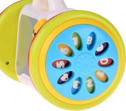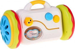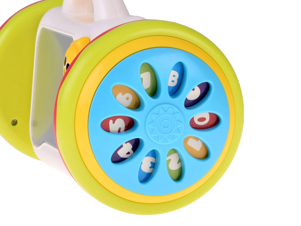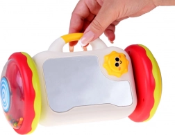 Roțile mari și colorate permit jucăriei să se rostogolească lin. Copilul o va urmări cu plăcere, va se târî după ea și își va întări în mod natural coordonarea și stabilitatea.