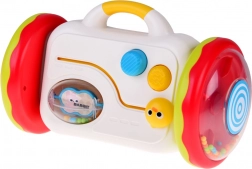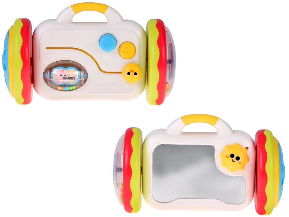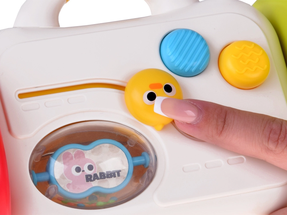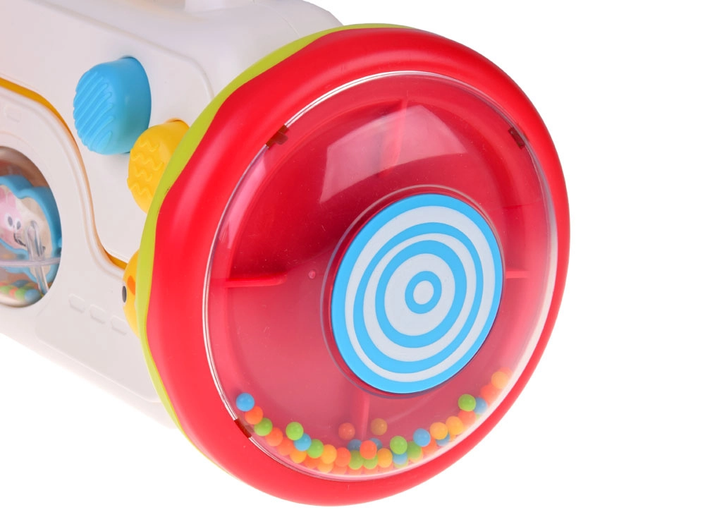 Jucăria interactivă pe roți îmbină distracția și învățarea. Copilul este atras de culorile vii, texturile variate, butoanele și glisoarele, fereastra transparentă cu mărgele și oglinda sigură pentru autoexplorare. Mânerul facilitează transportul, fiind un companion grozav acasă și în călătorii.