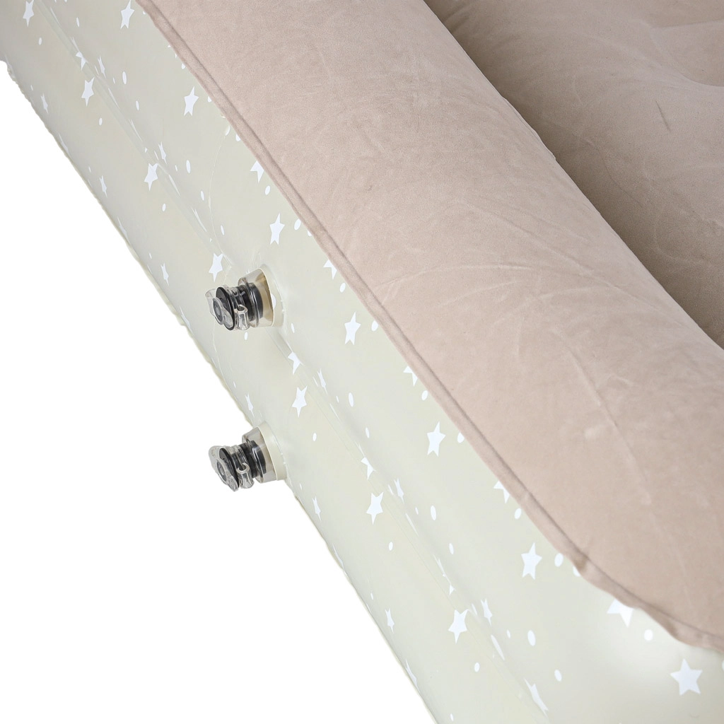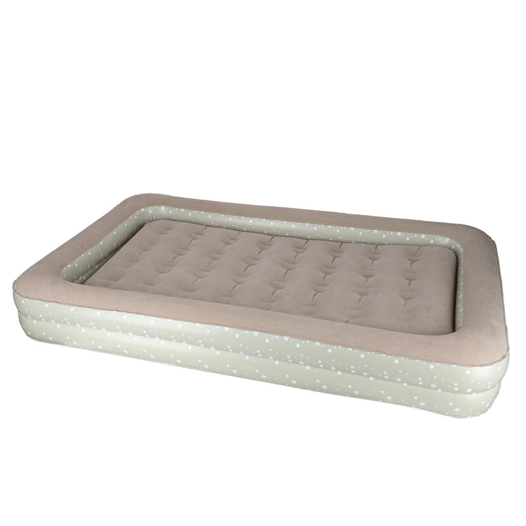 Pat gonflabil practic, din două piese, pentru copii, oferă somn în siguranță datorită marginilor înălțate și saltelei interioare separate. Pachetul include o pompă manuală cu diverse duze pentru umflare rapidă, plasture de reparare și instrucțiuni. Suprafața catifelată tip velur, imprimeul cu steluțe și dimensiunile compacte fac din acest pat o alegere ideală pentru călătorii, la bunici sau pentru oaspeți neașteptați. Capacitate de încărcare până la 50 kg, mărime pentru 1 copil.