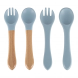 Bavețica ajustabilă din silicon cu buzunar adânc reține majoritatea resturilor și protejează hainele. Două seturi de tacâmuri (din silicon și cu mâner din lemn) sprijină diferitele etape de învățare a prinderii și preluării alimentelor. Cana cu capac și pai ajută la exersarea băutului independent fără vărsări inutile.