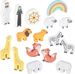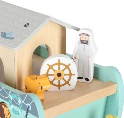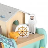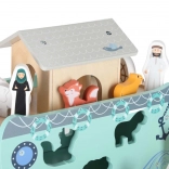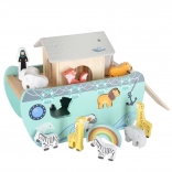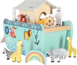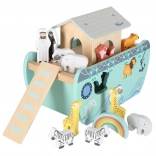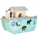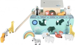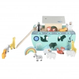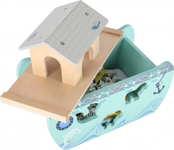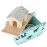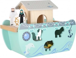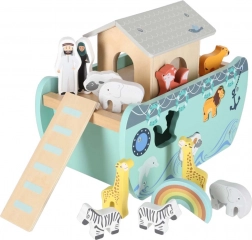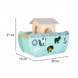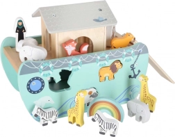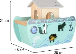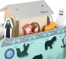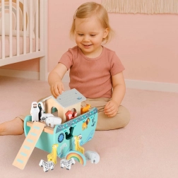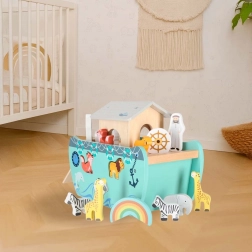 Descoperiți jucăria din lemn care îmbină sorterul de forme, jocul liber și povestirea. Arca, cu rampă și acoperiș detașabile, ascunde un set de figurine cu animale și două personaje, Noe și soția sa – copiii pot încărca barca, o pot conduce cu cârma și pot introduce animalele în deschiderile potrivite.