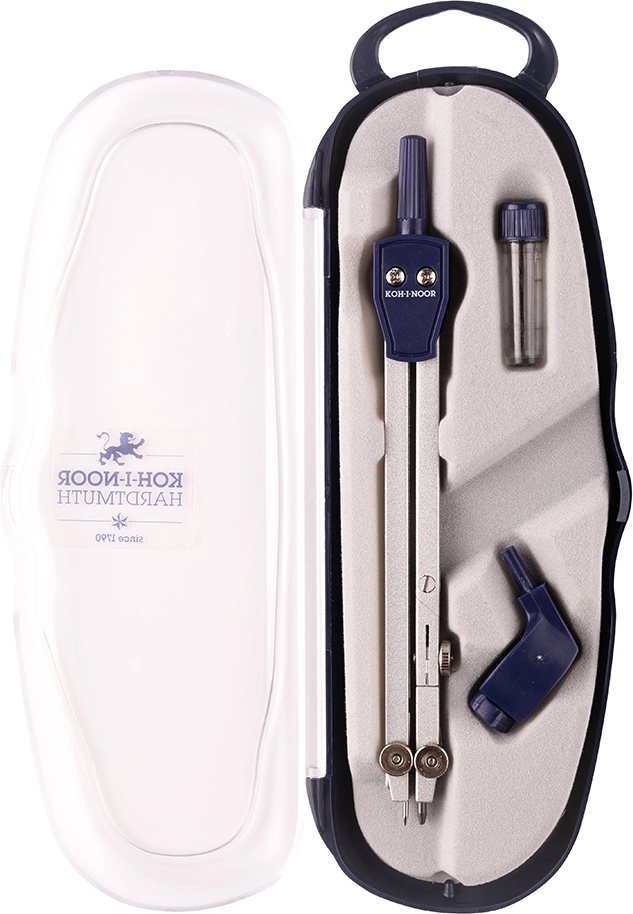 Compas școlar practic de la KOH-I-NOOR pentru trasarea precisă a cercurilor cu diametru de până la 360 mm. Include adaptor universal, creion mecanic cu 2 mine de rezervă și cutie rezistentă din plastic pentru depozitare sigură.
