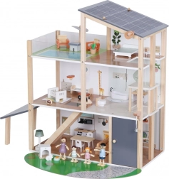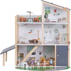 Descoperă căsuța spațioasă din lemn pentru păpuși, care va încânta orice copil de la 3 ani. Oferă mai multe etaje, încăperi complet utilate, un lift manual funcțional, terasă pe acoperiș și un adorabil iepuraș cu căsuță. Include o familie de patru membri și accesorii bogate pentru o joacă de rol nesfârșită și dezvoltarea imaginației.