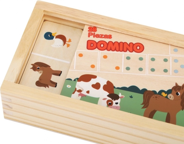 Descoperă farmecul dominoului din lemn cu două fețe cu tematică de fermă, care oferă două moduri de joacă într-un singur joc. Cei mici aliniază după imagini vesele cu animăluțe, iar cei mai mari joacă domino clasic cu puncte, exersând natural numărarea și logica. Lemnul natural de calitate, culorile pastelate plăcute și cutia din lemn cu capac îl transformă într-o jucărie frumoasă și rezistentă pentru copii de la 2 ani.