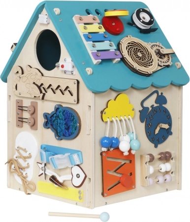 Căsuță Montessori turcoaz 2Kids Toys cu multiple activități: lacăte, labirint, xilofon, ceas și altele. Dezvoltă motricitatea fină, logica și independența. 3+.