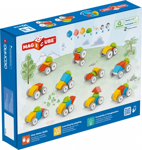 Descoperă lumea creativă cu setul magnetic GEOMAG Magicube auto cu 10 piese – o jucărie sigură și distractivă pentru copii de la 1 an. Datorită formelor magnetice și roților cu două șasiuri, copiii își pot construi cu ușurință prima lor mașinuță, dezvoltând motricitatea fină, imaginația și coordonația. Fabricat în Elveția din plastic reciclat.